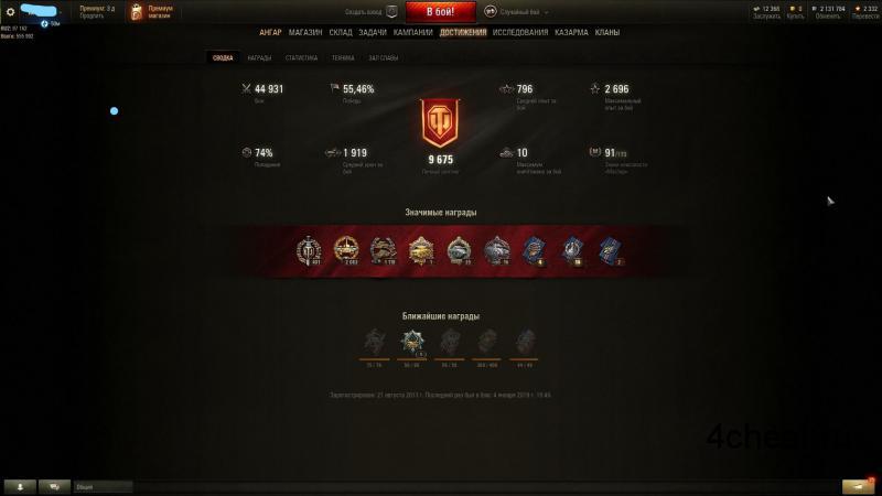 :Smile-playing:продам аккаунт WoT.45к боёв, 55% побед, средний уровень 8.65 почти все ветки исследованы,много прем и наградной техники(включая ёлку,защитник и т.д.)бонусом:пароль от песочницы.в ангаре более 50 видов техники.(в основном 10 ур с двумя-тремя отметками на пушке).так же более 12к бонов и купленного УСОВЕРШЕНСТВОВАННОГО оборудования за них.